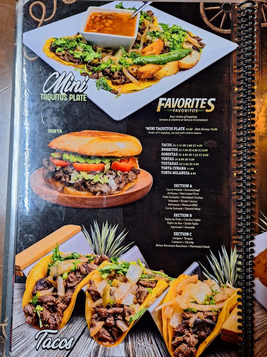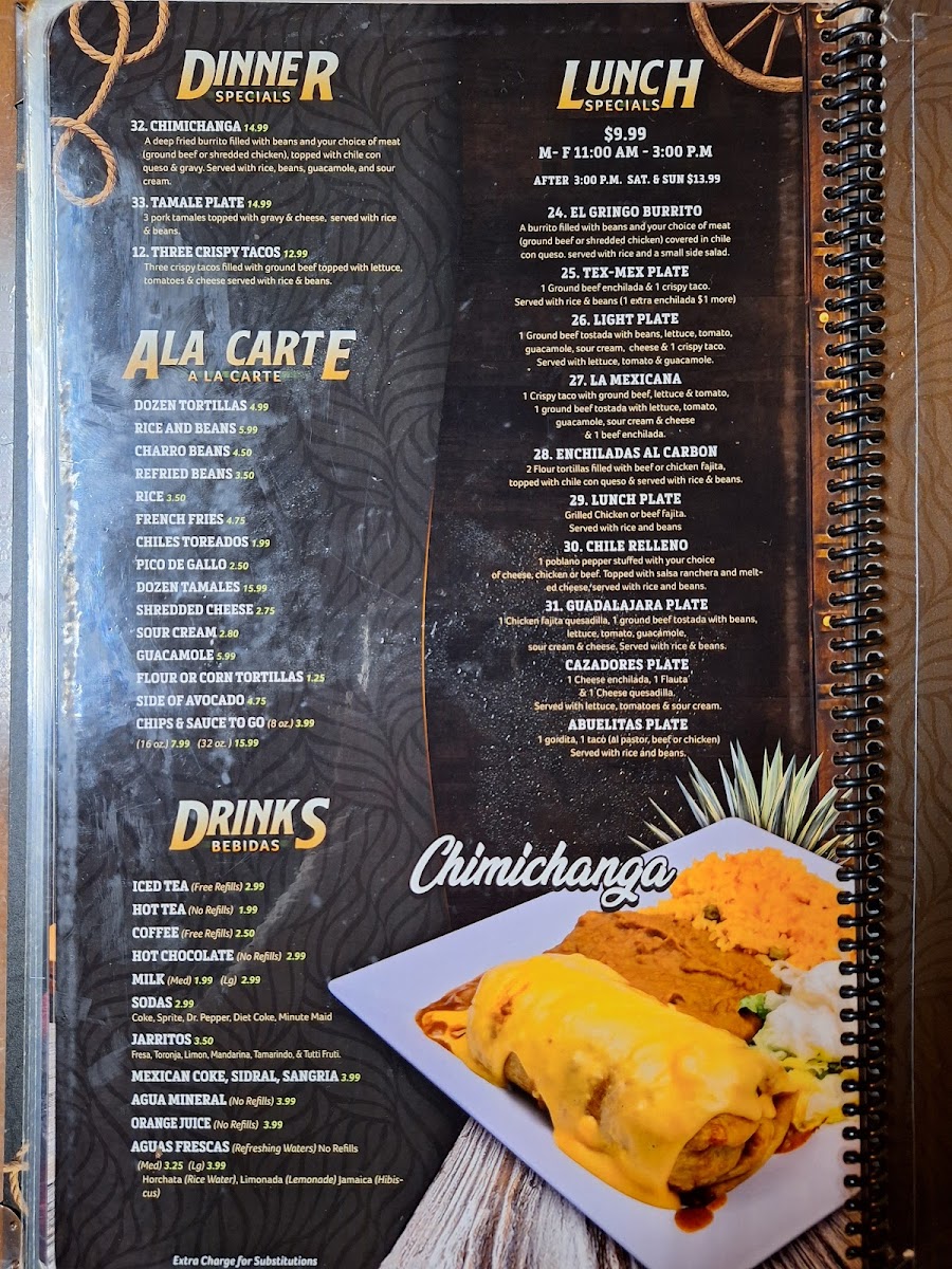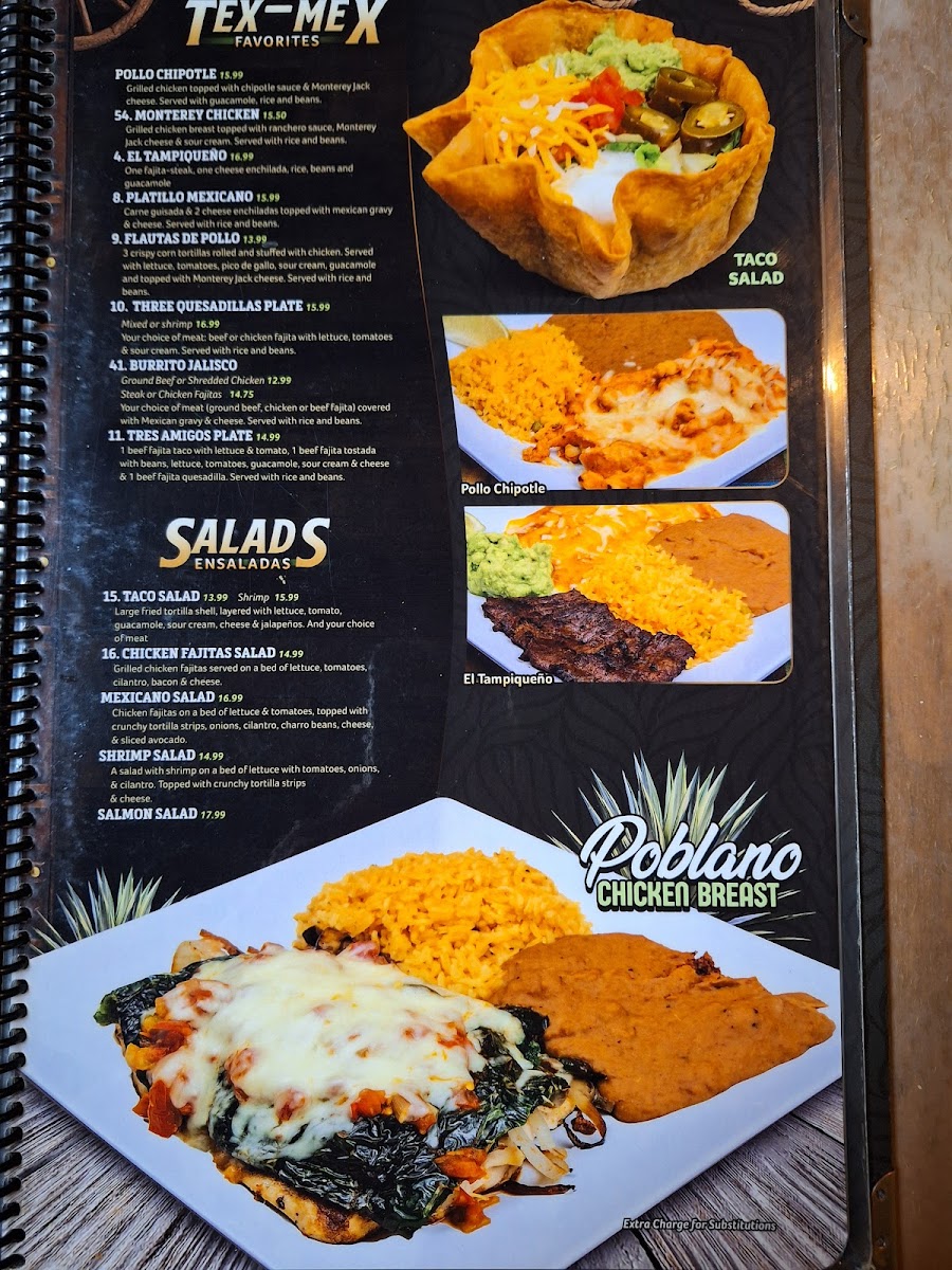 This menu is suitable for casual dining throughout the day, with offerings that cover breakfast, lunch, and dinner. It accommodates quick orders as well as more leisurely meals, providing familiar, well-established Mexican and Tex-Mex dishes.